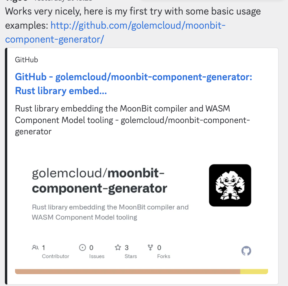 在这一过程中,MoonBit 生成的 WASM 组件不仅办事于 GolemCloud 云平台内部的对象链,也进一步在主流 WASM 插件生态中获得应用。例如,MoonBit 相干成果已进入 Extism 官方插件生态,表现了其在不合 WASM 工程场景中的可用性与成熟度。