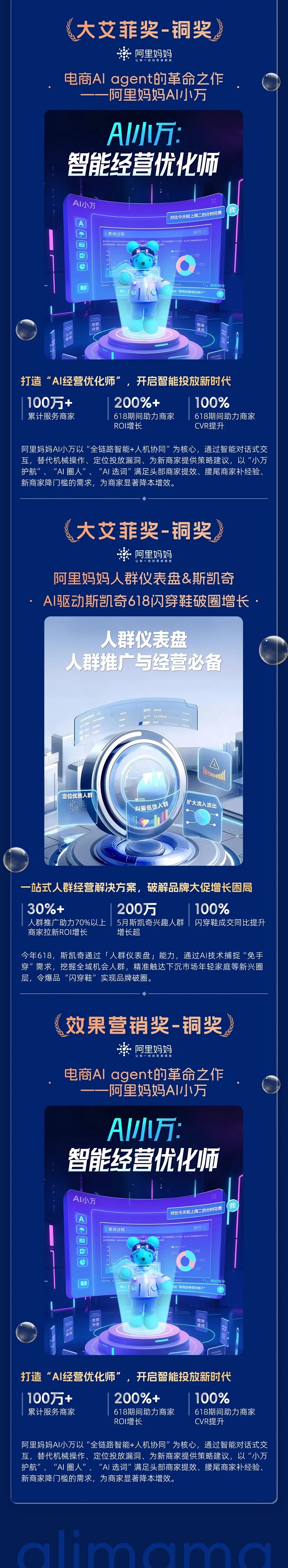 阿里妈妈成功搭建全链路智能投放助手AI小万,推动电商投放向人机协同革命性转型。AI小万以“全链路智能+人机协同”为核心,经由过程智能对话式交互,替代机械操作、定位投放马脚、为新商家供给策略建议,以“小万护航”、“AI圈人”、“AI选词”知足头部商家提效、腰尾商家补经验、新商家降门槛的需求,为商家明显降本增效。截至2025年6月,AI小万累计办事商家已超100万,618时代助力商家ROI增长200%+,CVR晋升100%,进一步印证了其在商家中的高应用率和广泛影响力,分别获得「后果营销奖」铜奖、「大年夜艾菲奖」铜奖。