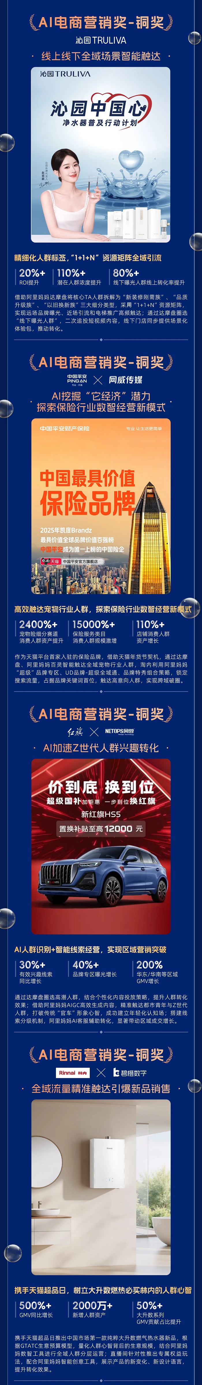 凭借对电商保险场景的开辟性实践,平安产险不仅实现了商号花费人群资产增长超110%,更推动了天猫平台保险类目兴趣人群的爆发式增长,全保险类目增长超15000%,宠物保险增长超2400%,荣获「AI电商营销奖」铜奖。