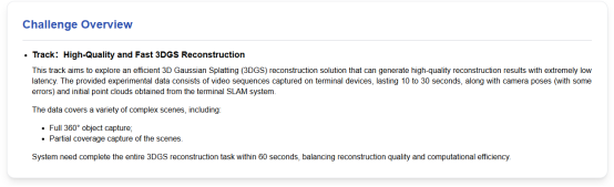 本次比赛为参赛团队设置了极具挑衅性的义务:参赛者需在60秒内,基于主办方供给的真实终端视频序列(10–30秒)、存在误差的相机轨迹以及终端 SLAM 点云,在极短时光内完成完全的3DGS 高质量重建。