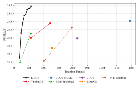 经由过程体系与算法的协同优化,LiteGS在练习效力与重建质量上均实现明显领先,建立了该范畴新的机能标杆。在达到与当前质量最优筹划一致水日常平凡,LiteGS可获得高达10.8倍的练习加快,且参数量削减一半以上;在雷同参数量下,LiteGS在PSNR指标上超出主流筹划0.2–0.4 dB,练习时光缩短3.8至7倍。针对轻量化模型,LiteGS仅需原版3DGS约10%的练习时光与20%的参数量,即可实现一致质量,展示出卓越的工程实用性与技巧前瞻性。