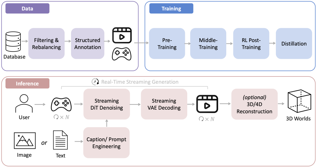 混元世界模型1.5(WorldPlay)初次开源了业界最体系、最周全的及时世界模型框架,涵盖数据、练习、流式推理安排等全链路、全环节,并提出了重构记忆力、长高低文蒸馏、基于3D的自回归扩散模型强化进修等算法模块。