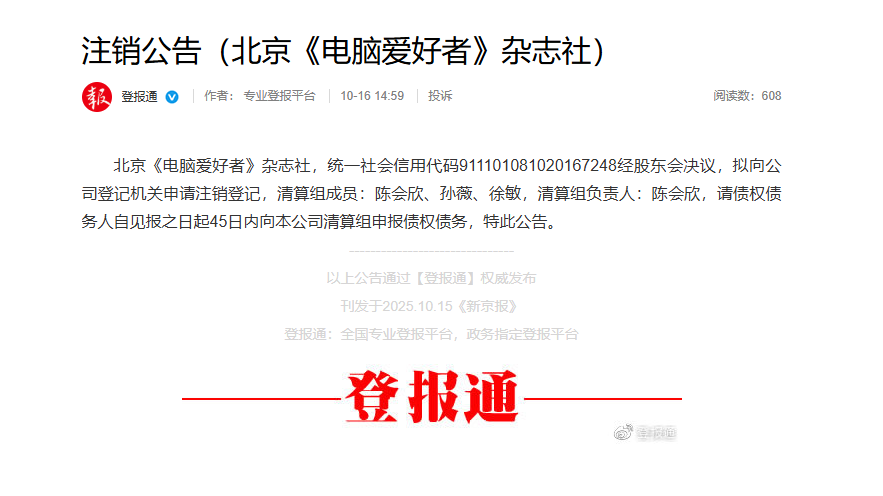 日前,《电脑爱好者》杂志刊出通知布告在收集上激发烧议。据懂得,该通知布告经由过程“登报通”刊发于2025年10月15日的《新京报》,通知布告位于当日报纸最后一页角落,须要放大年夜数倍才能看到。