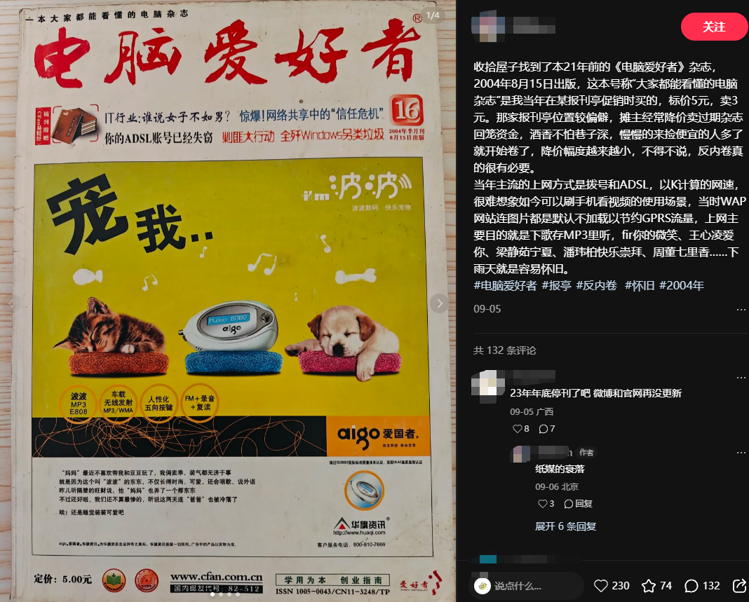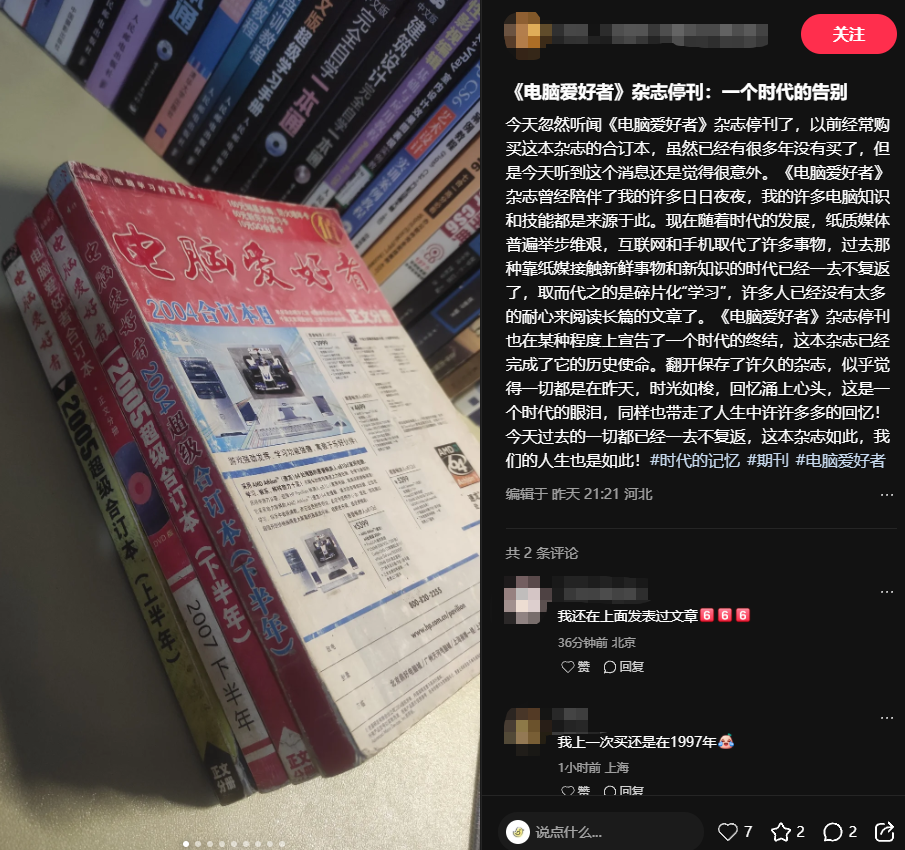 消息传出后,不少网友在社交平台留言感慨:“《电脑爱好者》我订过,昔时的光盘给我打开了新世界。”“真的是童年的回想,以前经常跑报刊亭买。”