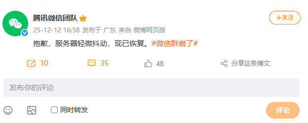 针对“微信群崩了”的话题,腾讯微信团队方才宣布通知布告称,“抱歉,办事器稍微颤抖,现已恢复。